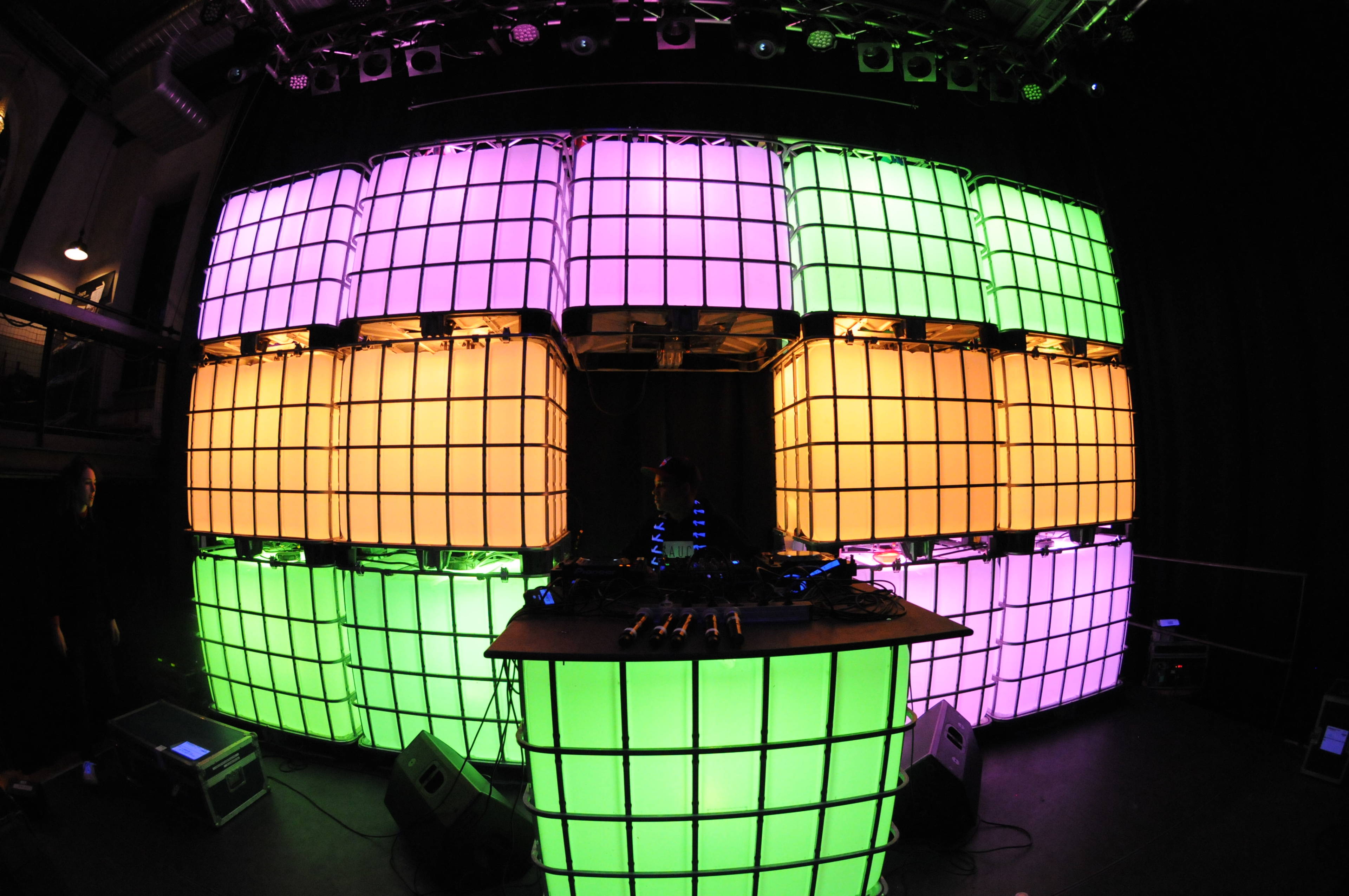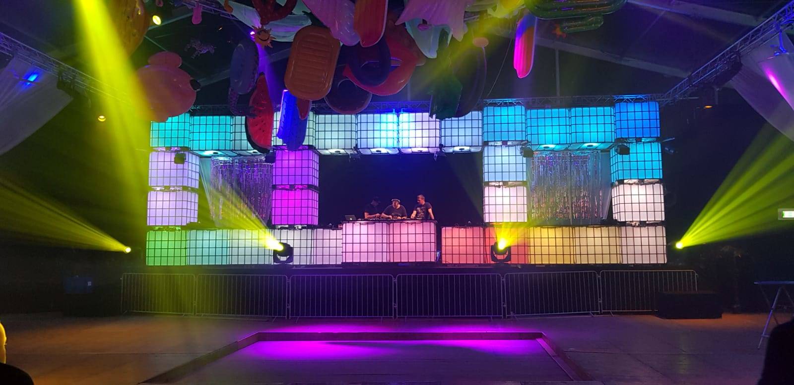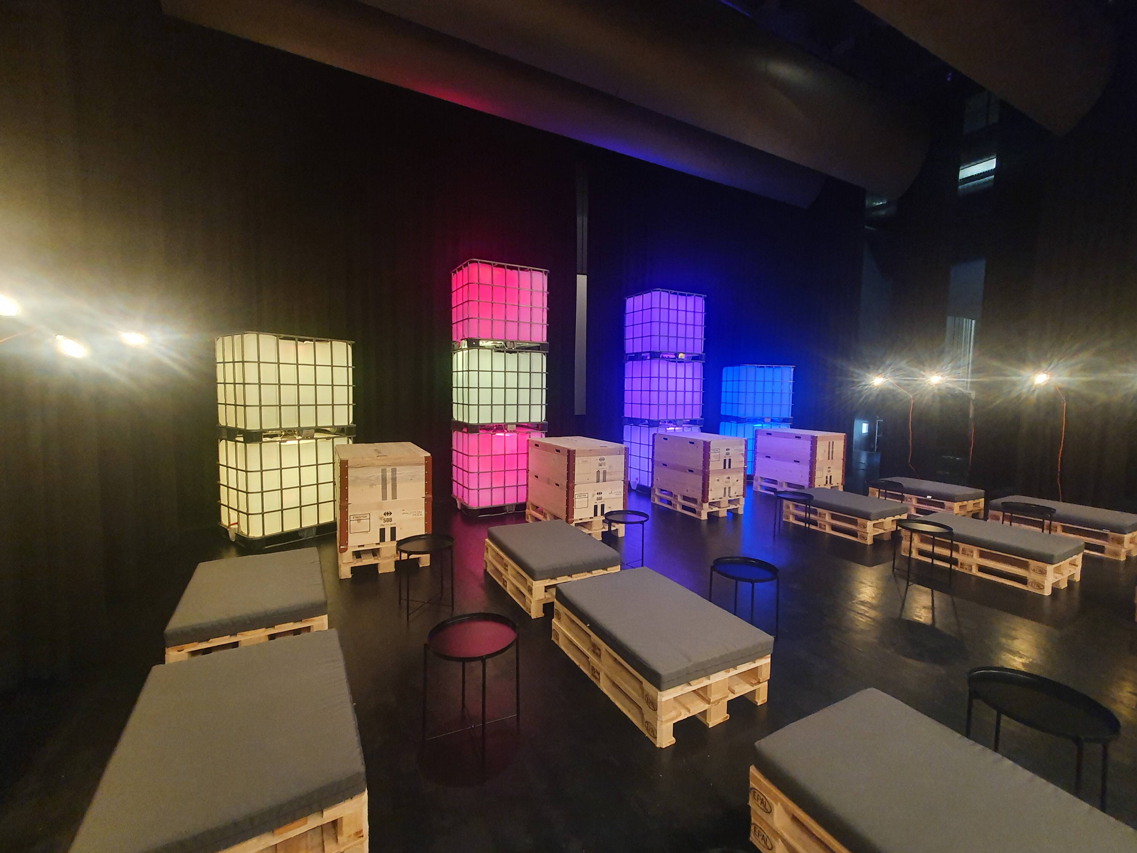 Tank-Elemente: Wand aus 20 Tanks mit Lichteffekten gekoppelt mit Audioanlage in der Beach DJ-Area.