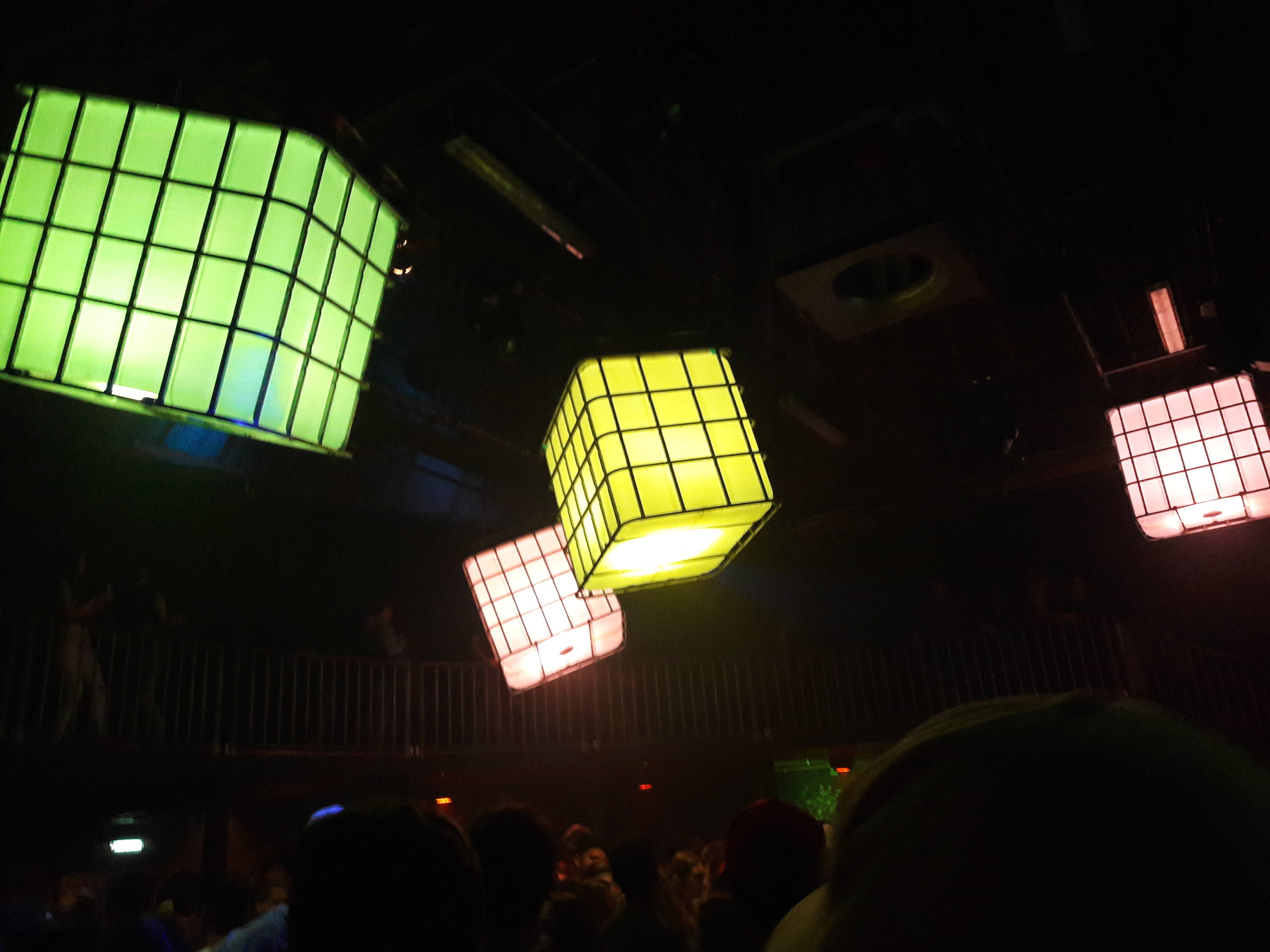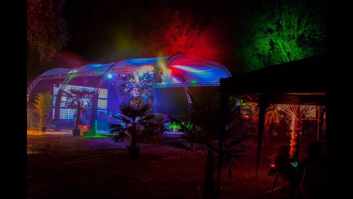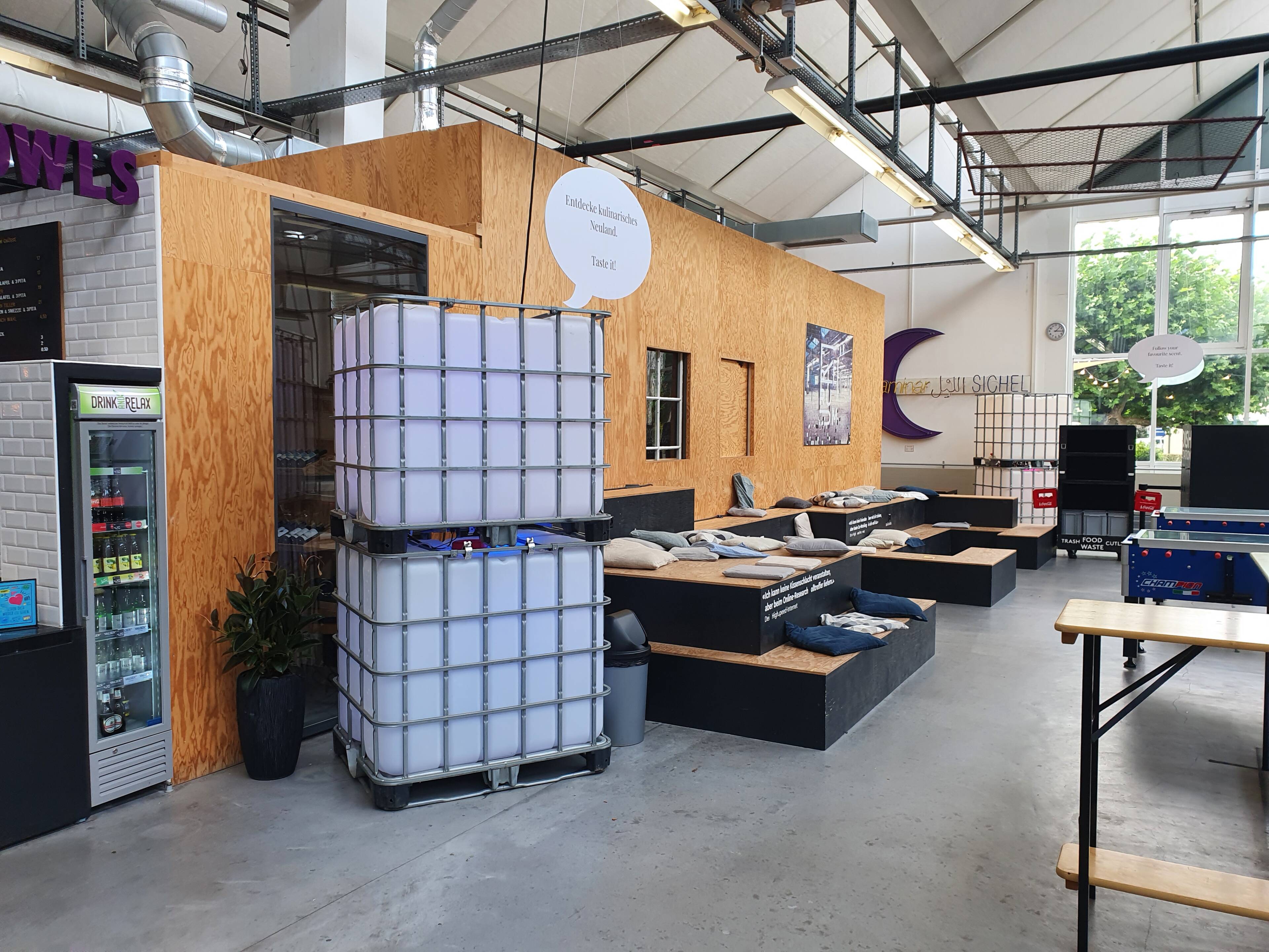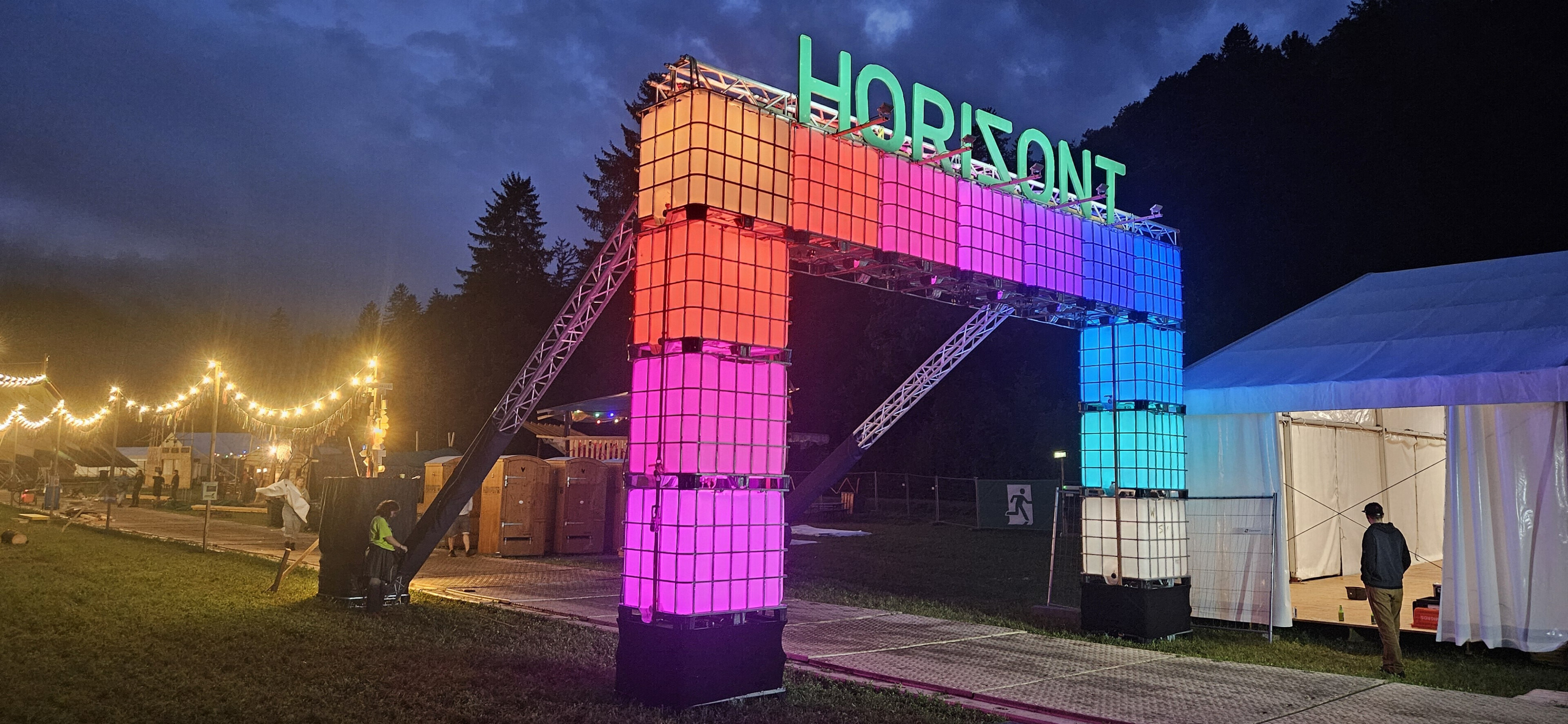Tank-Elemente: Wand aus 20 Tanks mit Lichteffekten gekoppelt mit Audioanlage in der Beach DJ-Area.