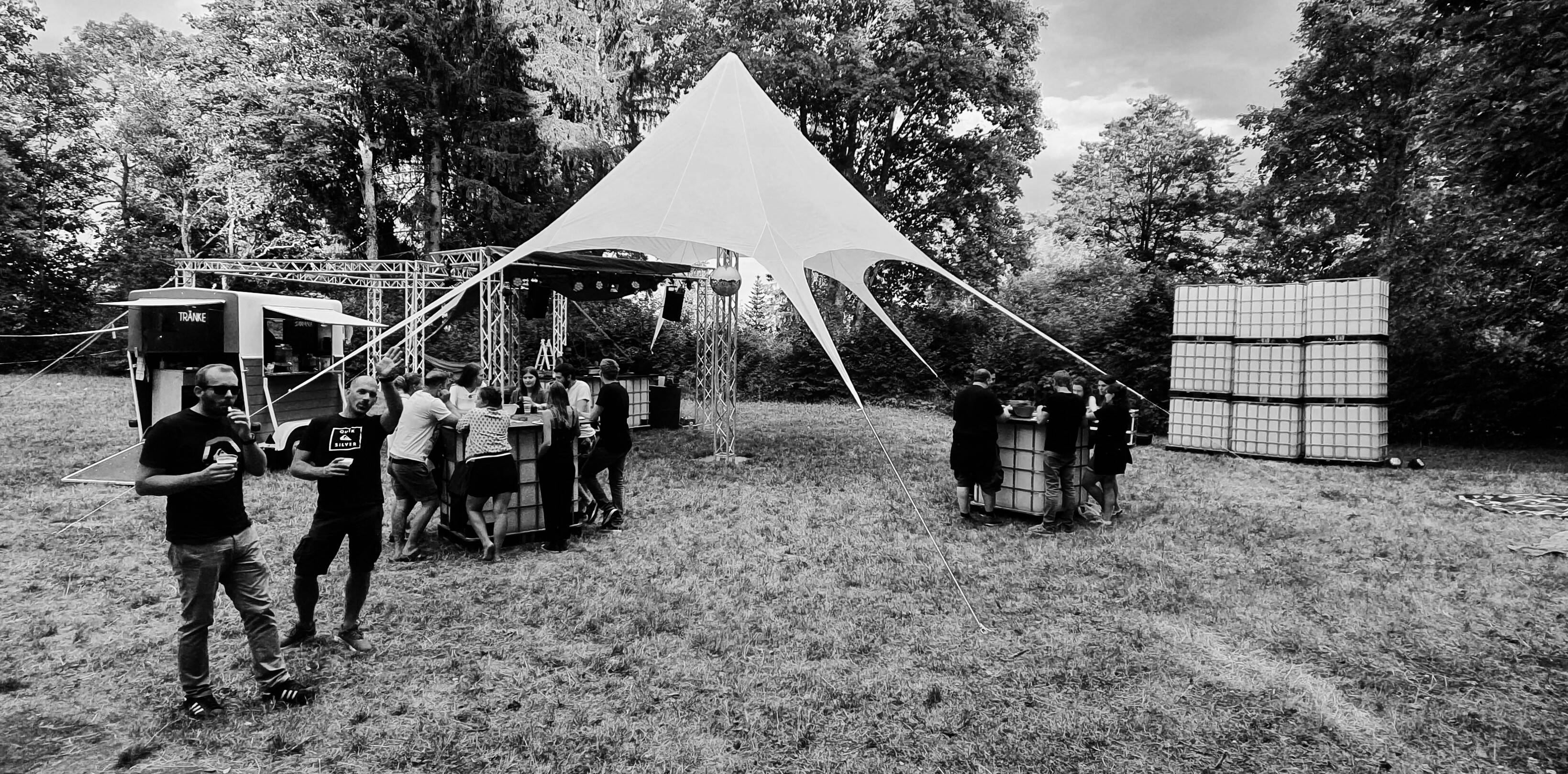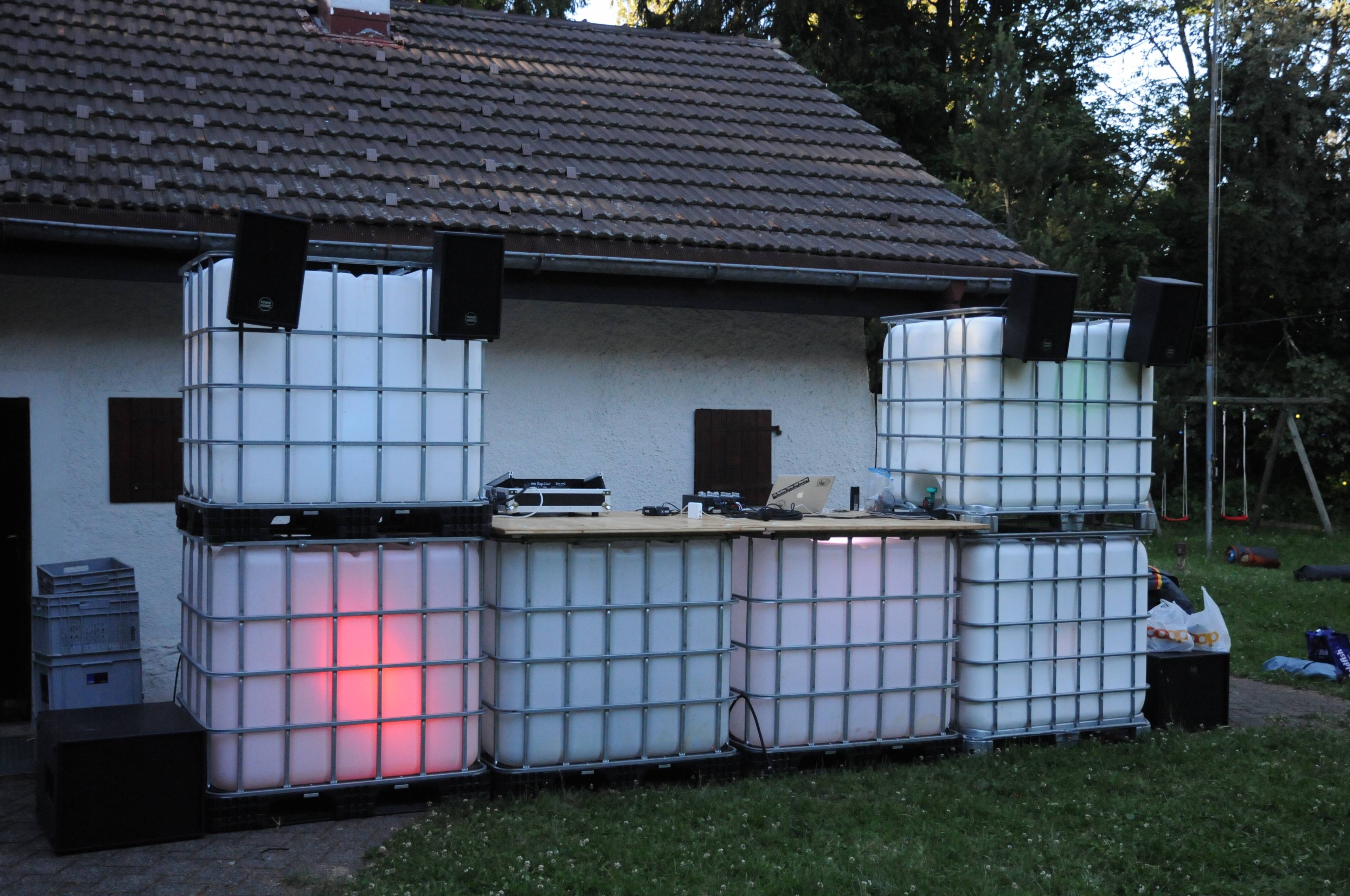 Tank-Elemente: 4 Bartische und 6 Tanks als DJ-Wand im Freien